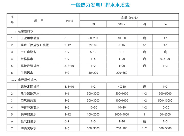 根據(jù)熱力發(fā)電廠生產(chǎn)特點,廢水分兩大類:一是經(jīng)常性排水,含酸含堿廢水、設(shè)備反洗廢水和生活污水;二是非經(jīng)常性排水,含油廢水、設(shè)備定期排污廢水、化學清洗廢水。早期熱力發(fā)電廠只對含酸含堿廢水和化學清洗廢水進行處理外,其余廢水直接排放,當今要求熱力發(fā)電廠對產(chǎn)生所有廢水分類處理,達標排放。