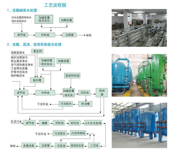 根據(jù)來水水質(zhì)和處理后的水質(zhì)標準,對純水裝置、取樣排水、鍋爐連續(xù)排水采用中和和過濾處理;對鍋爐酸洗水、鍋爐定期排污、除塵器洗凈水、空氣預熱器洗凈水、工業(yè)用水裝置、爐管沖洗灰水、爐筒洗凈水采用我們開發(fā)的物理化學法+生物法,即中和、絮凝、沉淀、生化處理、混凝、再過濾和殺菌工藝。